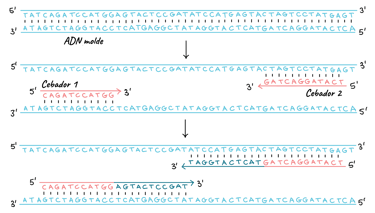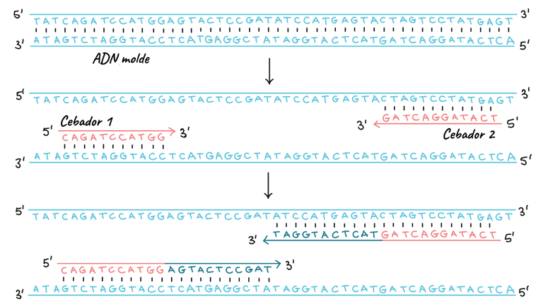 Cuando los cebadores se unen al molde, la polimerasa los extiende y la región que se encuentra entre ellos se copia.
