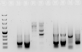 Habitualmente, los resultados de una reacción de PCR se visualizan (se hacen visibles) al usar electroforesis en gel. La electroforesis en gel es una técnica en la que una corriente eléctrica impulsa fragmentos de ADN a través de una matriz de gel y los fragmentos de ADN se separan según su tamaño. Típicamente se incluye un estándar, o marcador de peso molecular, para que pueda determinarse el tamaño de los fragmentos en la muestra de PCR.