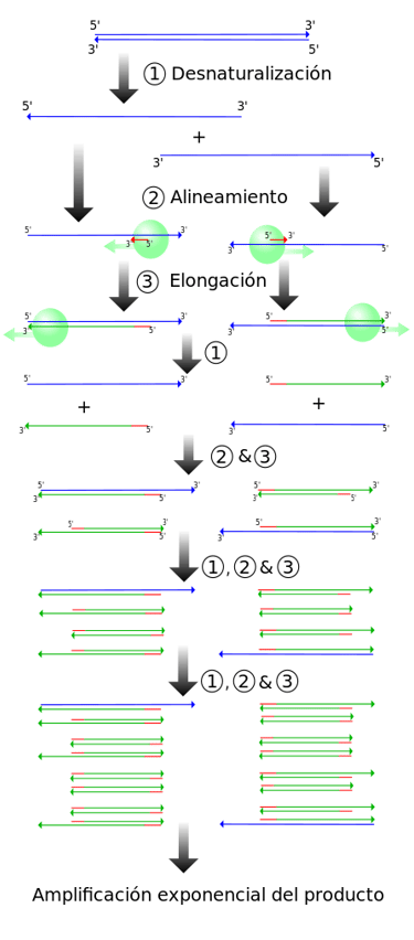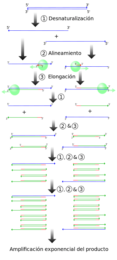 Este ciclo se repite varias veces en una reacción de PCR típica, que generalmente tarda unas horas, según la longitud de la región de ADN que se copia. Si la reacción es eficiente (funciona bien), puede producir miles de millones de copias a partir de una o unas cuantas copias de la región blanco. Eso es porque no solo se usa el ADN original como molde en cada ciclo. En realidad, el nuevo ADN que se produce en una ronda puede servir como molde en la siguiente ronda de síntesis de ADN. Hay muchas copias de los cebadores y muchas moléculas de Taq polimerasa flotando en la reacción, por lo que el número de moléculas de ADN casi puede duplicarse en cada ciclo. La siguiente imagen muestra este patrón de crecimiento exponencial.